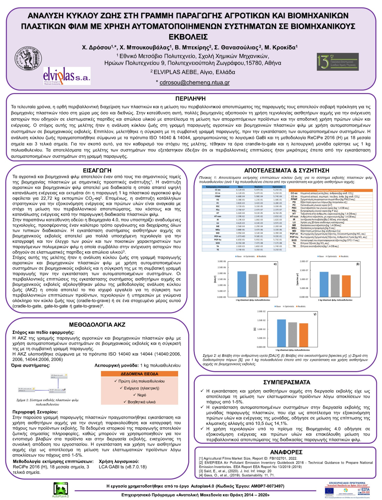 Τα τελευταία χρόνια, η ορθή περιβαλλοντική διαχείριση των πλαστικών και η μείωση του περιβαλλοντικού αποτυπώματος της παραγωγής τους αποτελούν σοβαρή πρόκληση για τις βιομηχανίες πλαστικών τόσο στη χώρα μας όσο και διεθνώς . Στην κατεύθυνση αυτή , πολλές βιομηχανίες αξιοποιούν τη χρήση τεχνολογίας αισθητήρων αιχμής για την ανίχνευση αστοχιών που οδηγούν σε ελαττωματικές παρτίδες και απώλεια υλικού με αποτέλεσμα τη μείωση των απορριπτόμενων προϊόντων και την αποδοτική χρήση πρώτων υλών και ενέργειας. Ο στόχος αυτής της μελέτης ήταν η ανάλυση κύκλου ζωής στη γραμμή παραγωγής αγροτικών και βιομηχανικών πλαστικών φιλμ με χρήση αυτοματοποιημένων συστημάτων σε βιομηχανικούς εκβολείς. Επιπλέον, μελετήθηκε η σύγκριση με τη συμβατική γραμμή παραγωγής, πριν την εγκατάσταση των αυτοματοποιημένων συστημάτων. Η ανάλυση κύκλου ζωής πραγματοποιήθηκε σύμφωνα με τα πρότυπα ISO14040 & 14044, χρησιμοποιώντας το λογισμικό GaBi και τη μεθοδολογία ReCiPe2016 (H) με 18 μεσαία σημεία και 3 τελικά σημεία. Για τον σκοπό αυτό, για τον καθορισμό του στόχου της μελέτης, τέθηκαν τα όρια crandle-to-gate και η λειτουργική μονάδα ορίστηκε ως 1kg πολυαιθυλενίου. Τα αποτελέσματα της μελέτης των συστημάτων που εξετάστηκαν έδειξαν ότι οι περιβαλλοντικές επιπτώσεις ήταν μικρότερες έπειτα από την εγκατάσταση αυτοματοποιημένων συστημάτων στη γραμμή παραγωγής.